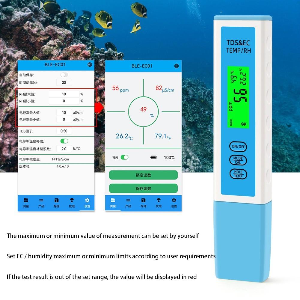 [4 in 1 EC Meter with Bluetooth] ed by the mobile App, professional measurement of EC, TDS, humidity, and Temp. suitable for household drinking water, hydroponics, lab, aquarium.