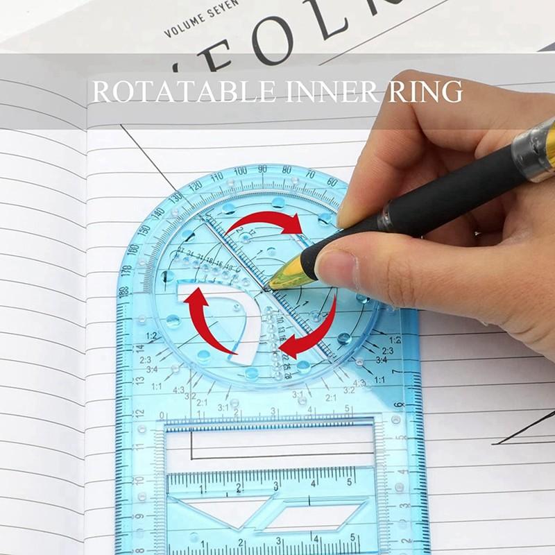 Creative Design - Rotating dot design allows you to easily draw a small circle. There are some rotating dots on the ruler and you can draw circles with different radii.The left hand thumb press on the ruler, index finger Rotates with dots on the ruler, The Light hand hold pen to draw.The corner of the geometric ruler is designed as an arc, which is not easy to hurt hands.